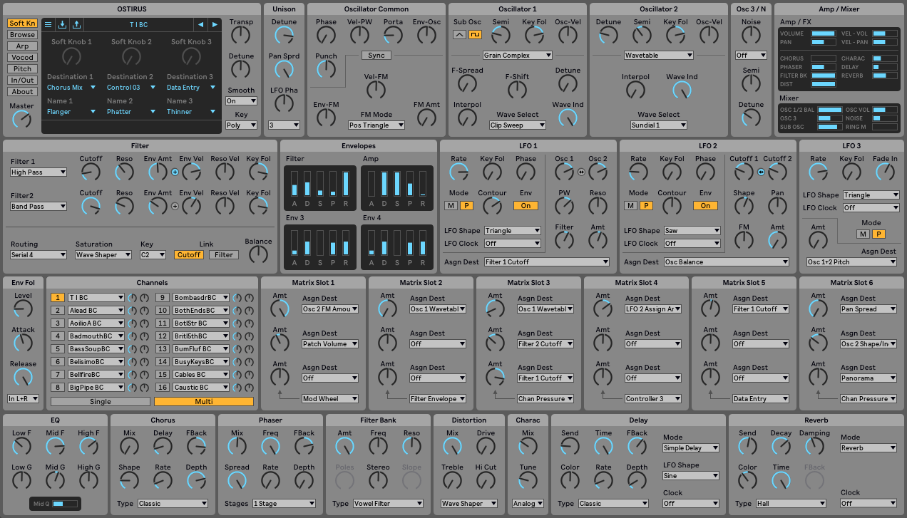 OsTIruston is a skin for the OsTIrus synthesizer. Designed to match the look and feel of Ableton Live, it displays almost all of the controls on screen simultaneously. It might be useful for preset designers. It currently has two color themes: Light and Dark.